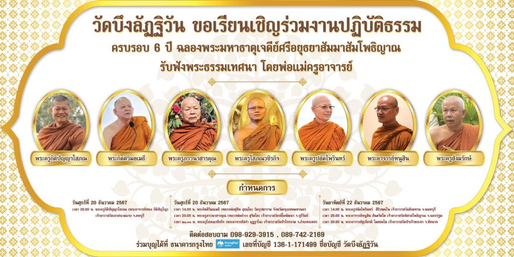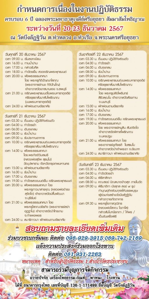 วัดบึงลัฏฐิวัน ขอเชิญร่วมงามปฏิธรรมครบรอบ 6ปี ฉลองพระมหาธาตุเจดีย์ศรีอยุธยาสัมมาสัมโพธิญาณ ในวันที่ 20 – 23 ธันวาคม 2567